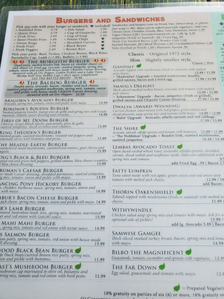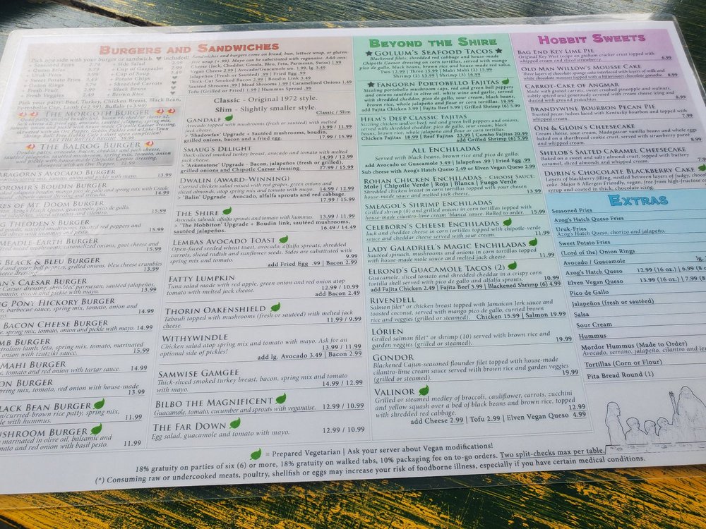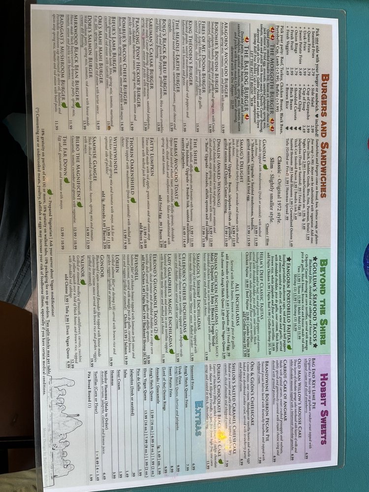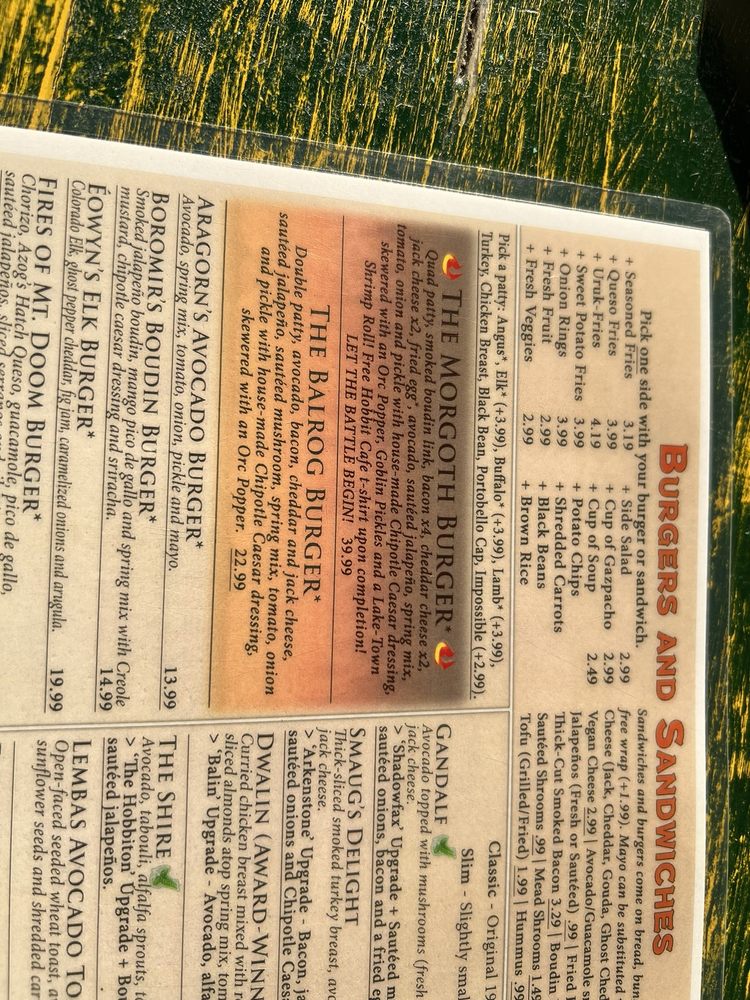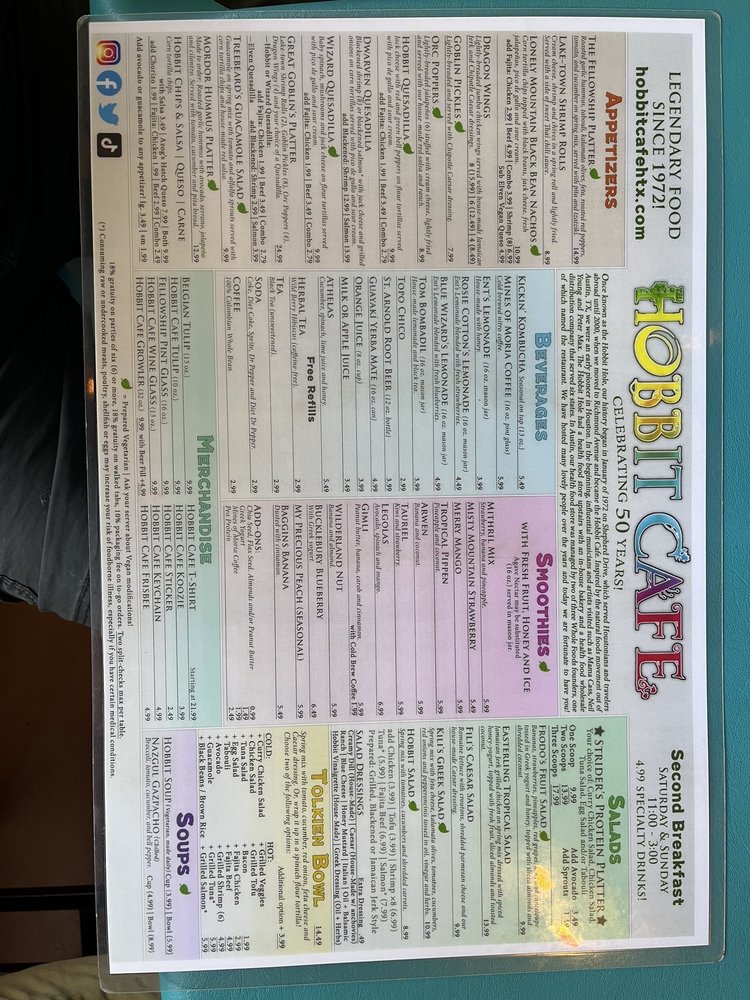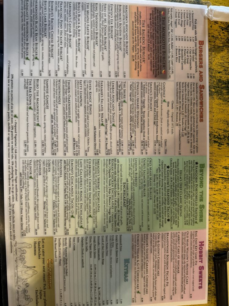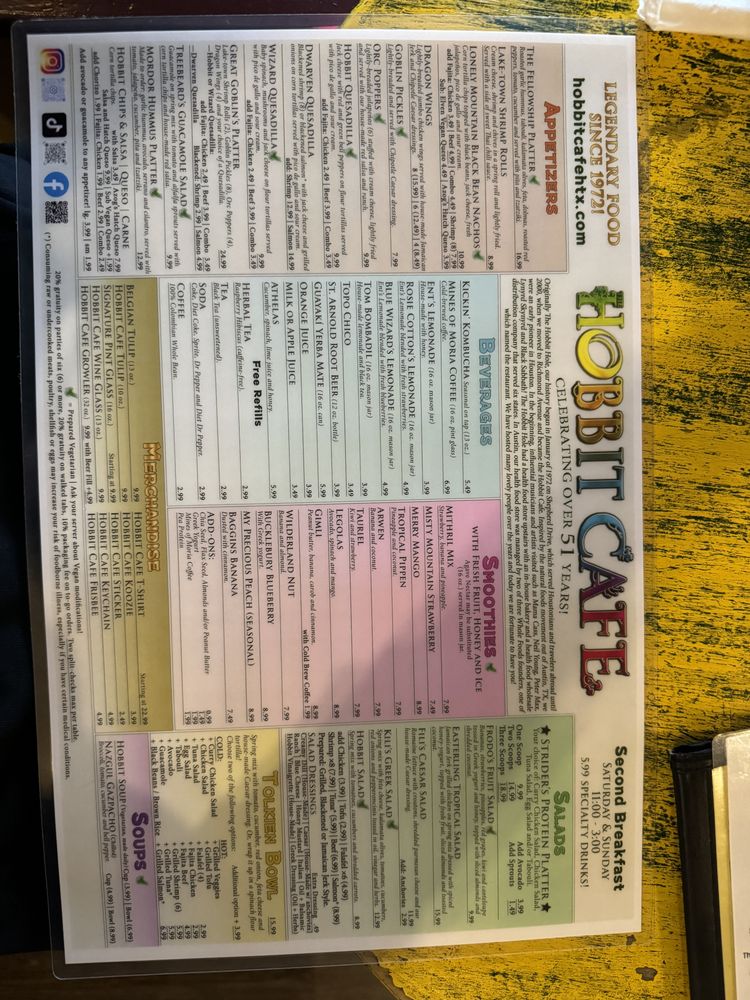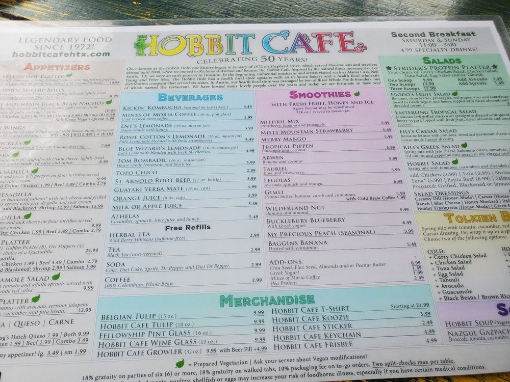 Introducing the menu at Hobbit Cafe, located in Houston, TX, offers a unique dining experience with a variety of options for both vegetarians and meat lovers. The menu includes delicious smoothies like the Mithril Mix and Tauriel Kiwi Strawberry, along with brunch dishes such as Poached Salmon Benedict and Boudin and Eggs. Customers rave about the flavorful food and friendly service at this cozy, themed restaurant. With a diverse selection of meads and creative pancake variations, Hobbit Cafe is a must-visit for those seeking a fun and tasty dining experience. Try the Fellowship appetizer or indulge in a boudin burger for a satisfying meal that will transport you to the world of Middle Earth.